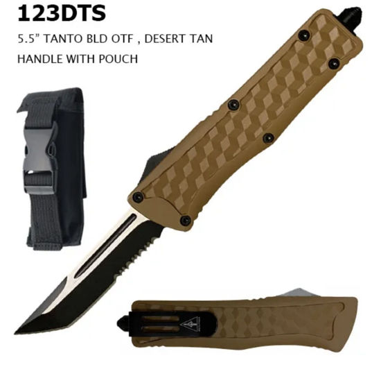 OTF AUTOMATIC KNIFE 9″ OVERALL. STAINLESS STEEL TANTO BLADE, 5″ CLOSED DESERT TAN HANDLE WITH CLIP INCLUDES MOLLE NYLON SHEATH
