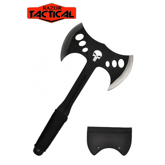 440 STAINLESS STEEL HATCHET AXE W/ SHEATH SOLID ONE PIECE 440 STAINLESS STEEL ROUGH BLACK PAINT. OVERALL LENGTH: 13.25" CORD WRAPPED HANDLE. BLACK NYLON SHEATH