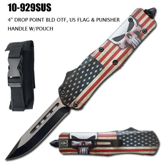 DELTA FORCE USA 4.15″ CLOSED, 7″ OVERALL, OTF KNIFE.BLACK STAINLESS STEEL DROP POINT BLADE, PUNISHER & US FLAG HANDLE WITH MOLLE NYLON SHEATH
