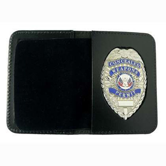 Genuine leather Permit viewing window is 3.75" x 1.75" Metal concealed weapon permit badge, gold-tone with flag center emblem